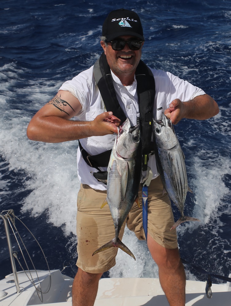 We had our third double takedown of our journey this afternoon. If you recall, a double takedown is when you land two fish at the same time. That’s a photo of me this afternoon with my new yellowfin tuna tattoo on my right arm, my new yellowfin tuna in my right hand, and a bluejack tuna in my left. And this time we caught them with a twist.