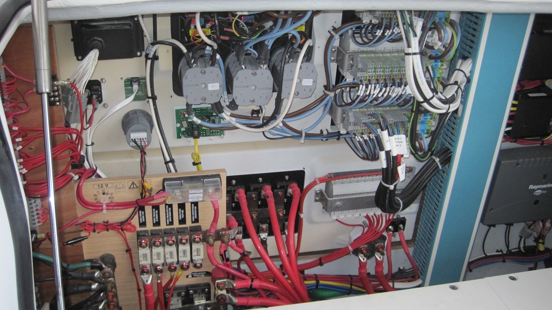 3: In Tonga we had a moment straight out of the Keanu Reeves film “Speed”. We were doing a quick afternoon motor on Sophie between islands. I was driving. Sandra Bullock (Jenna) came up to the flybridge and said “Oh, you have the engine controls on downstairs.” (Sophie has dual steering stations, and you can switch between them depending if you want to operate the boat from inside or outside.) I said “no, I am driving from up here.” But the “up here” engine control indicator light was off. So I switched it to “up here”. Nothing hapened. I went downstairs and tried to drive from there. Nothing happened. We couldn’t slow down the boat. We couldn’t even turn off the engines, which were both running at 2400 RPM in forward, pushing Sophie along at 7 knots. We couldn’t stop the boat, which is about as big as the bus in the film. Thankfully we had a couple of miles of sea room between the islands in flat seas on a sunny afternoon. It would have been worse if we were in a harbor in the rain trying to dock as we smashed into other boats, fuel tanks, swimmers and fishing nets. There was obviously a blown fuse or circuit breaker between the controls and the engines. Jenna took over the wheel and calmly drove the boat in broad circles while I calmly hunted around engine rooms, electrical panels and various crawls spaces looking for the location of the fault. I couldn’t find it. After a while I called Steve Schufrieder at YachtMasters in Seattle. He installed most of the electrical systems on Sophie. I think he was in his backyard having a beer with a friend, but it was hard to tell because Sophie’s engines were loud. So I hung up and decided to kill the engines by closing the fuel lines that feed them. Each engine “dieseled” for 2 minutes, then died. In the meantime Jenna had calmly rolled out the jib, and we knew we could always sail into Port Maurelle (home of the pig roast) if we couldn’t get the engines back on. I called Steve back, and he suggested I try the emergency starting circuit on Sophie’s port engine. Sophie doesn’t have dedicated engine starting batteries. It has a single bank of 12 volt batteries with 2200 amp hours of capacity (for sailboats, that’s a LOT) which we use for the “house” (lights, stereo, dishwashers, navigation, etc.) as well as for starting the engines. In the event of the house battery bank running out, there is an emergency starting battery for the port engine with its own dedicated circuit to the port engine’s controls. So I turned off the main engine battery switches, turned on the emergency battery switch, and the port engine controls lit up with a happy sense of eagerness to please. I fed the engine some fuel using the manual priming pump on the fuel filter, pushed the engine’s Start button, and it started right up! The starboard engine’s controls remained dead to the world. This was all good news because it meant that we could drive the boat with one motor to Port Maurelle and get a mooring, that our engine controls were not broken, and that we had blown a fuse somewhere. Steve Schufrieder suggested it was the main engine fuse. I went back to Sophie’s main electrical panel, which is located under a bench in the aft cockpit.