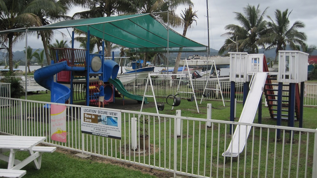 8: The Royal Suva Yacht Club has an outdoor bar adjacent to an enclosed playground. Yacht club members sit at picnic tables and drink Fiji Bitter while talking rugby and boats as their children safely play right in front of them.