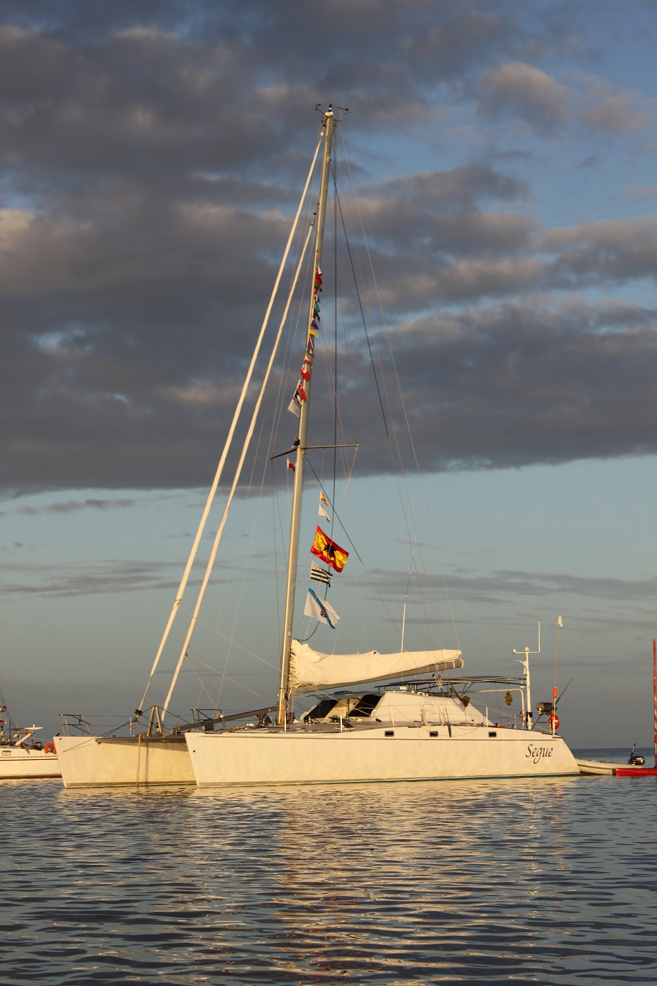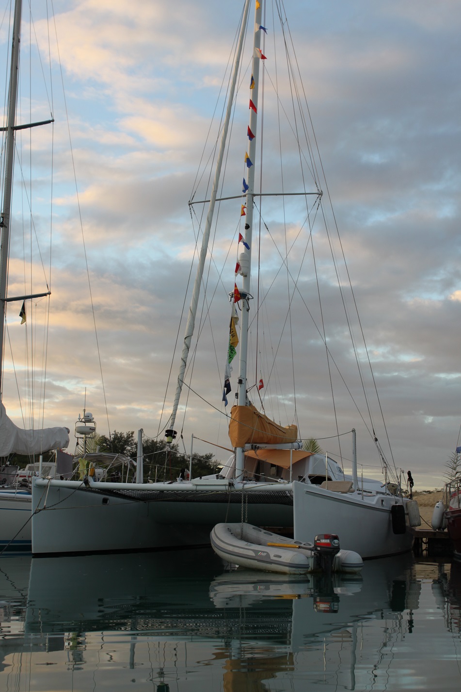 There actually is quite an interesting collection of boats moored right next to us. There is a Wharram catamaran right there. This is a 51, and my brother David built a 20 foot version when he was in high school.
