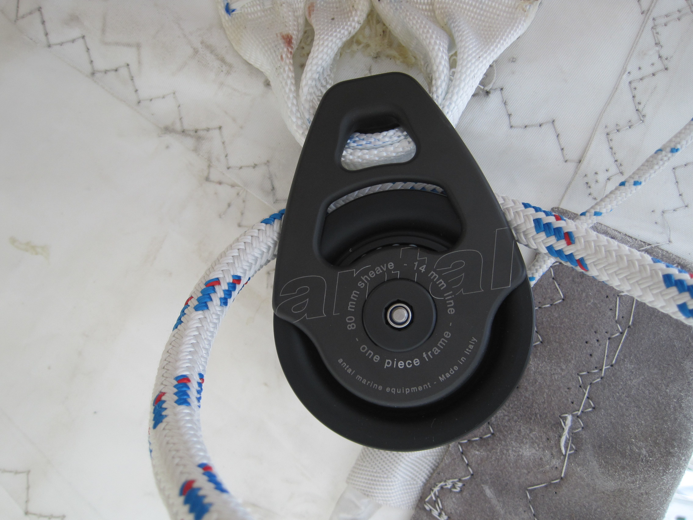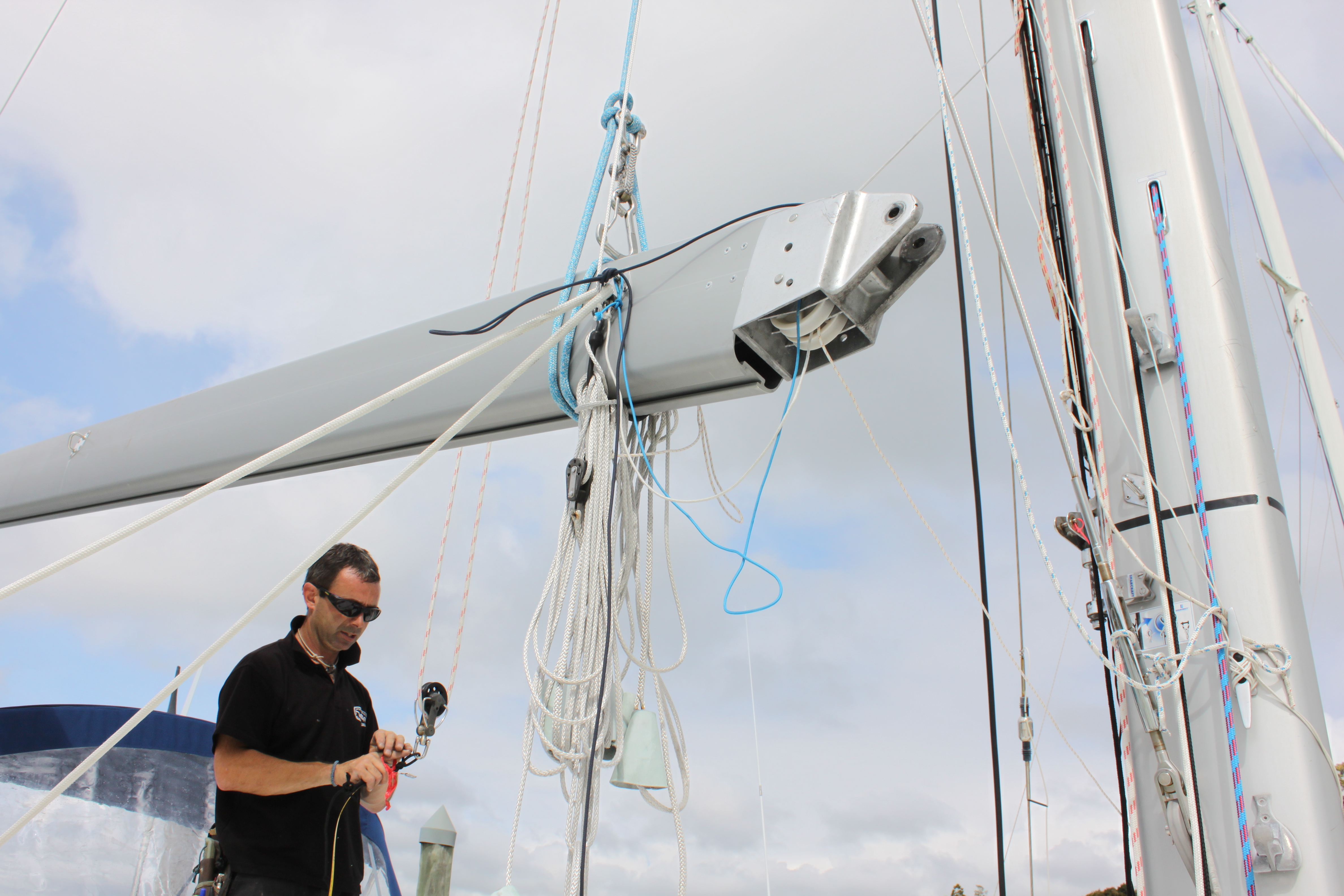 They replaced and/or repaired the sheaves at the top of the mast, at the end of the boom and on the traveler. They replaced the main halyard (chafe at the top of the mast) and the spinnaker halyard (too stretchy, especially if we are going to rig the code zero permanently). They now look nice and are Christmas colored. Here is the spinnaker halyard: