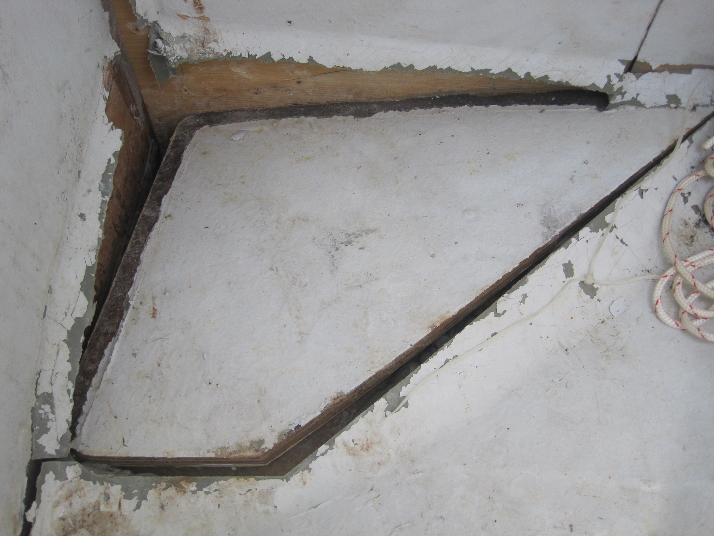 As I mentioned in a previous post, we experienced some problems with the bulkheads (walls) in the forward lockers behind each trampoline. The pounding over the course of our Pacific crossing caused the walls and floors to separate, ultimately allowing a decent amount of seawater to drain into our starboard bilge on our last passage, from Fiji to Opua. This is a phenomenon cruisers try to avoid. We use these lockers to store spare anchors, anchor chain, and piles of extra lines and rope which all became quite heavy when wet. I now believe this added weight contributed to the damage.