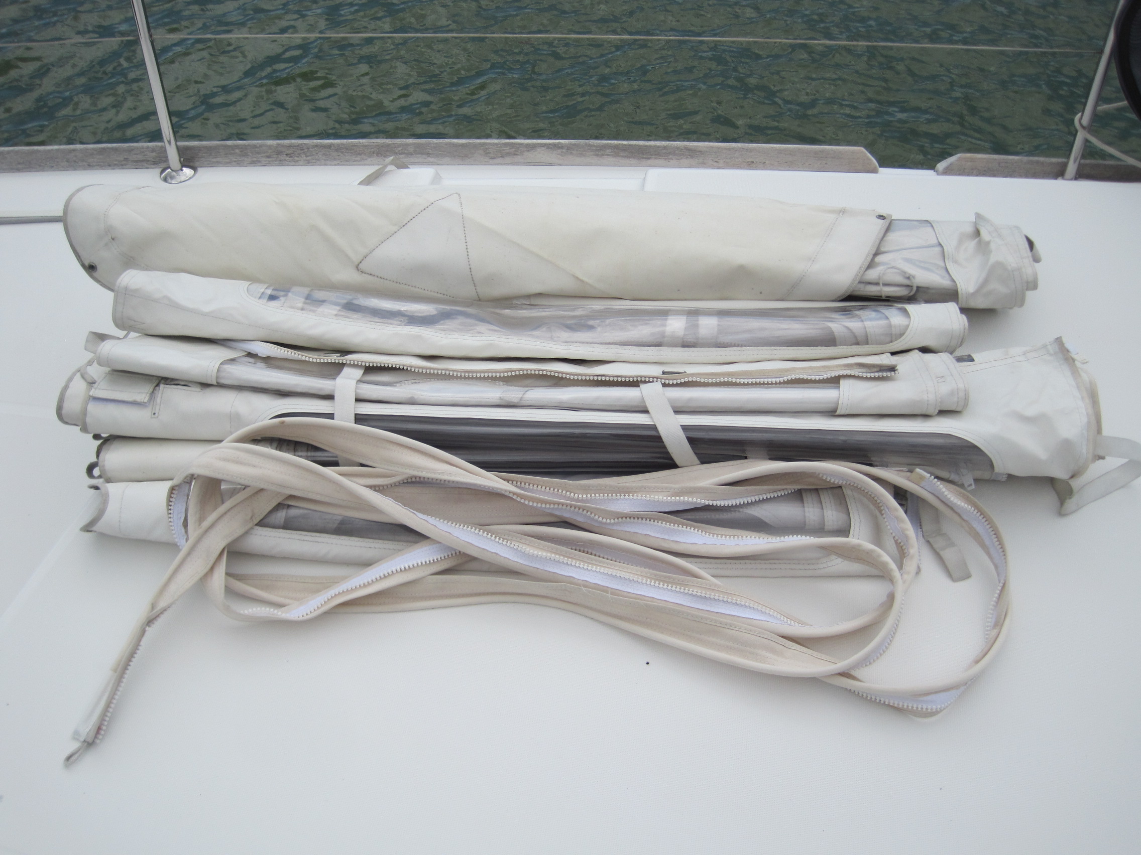 We also have a mainsail cover made from the same Sunbrella fabric as the bimini. Over the course of the crossing the cover crept forward along the boom, causing the forward edges of the cover to come in contact with reefing lines, which resulted in some significant chafe damage.