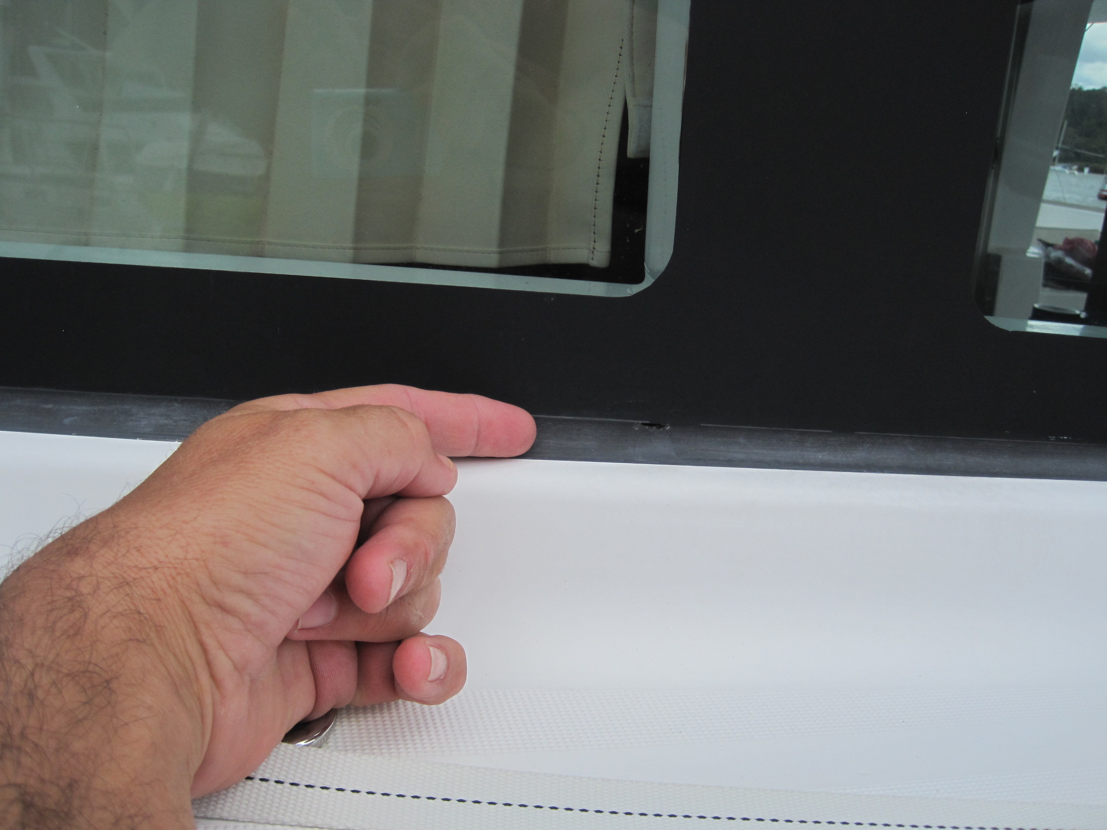 Once the water gets inside of the window seal pinprick, it travels along the fiberglass base of the window in search of any kind of opening that gives it the opportunity to enter the cabin and make the floor slippery and wet. We found a tiny hole in the seal right here, where a bolt goes through the fiberglass in order to connect the flybridge to the deck.