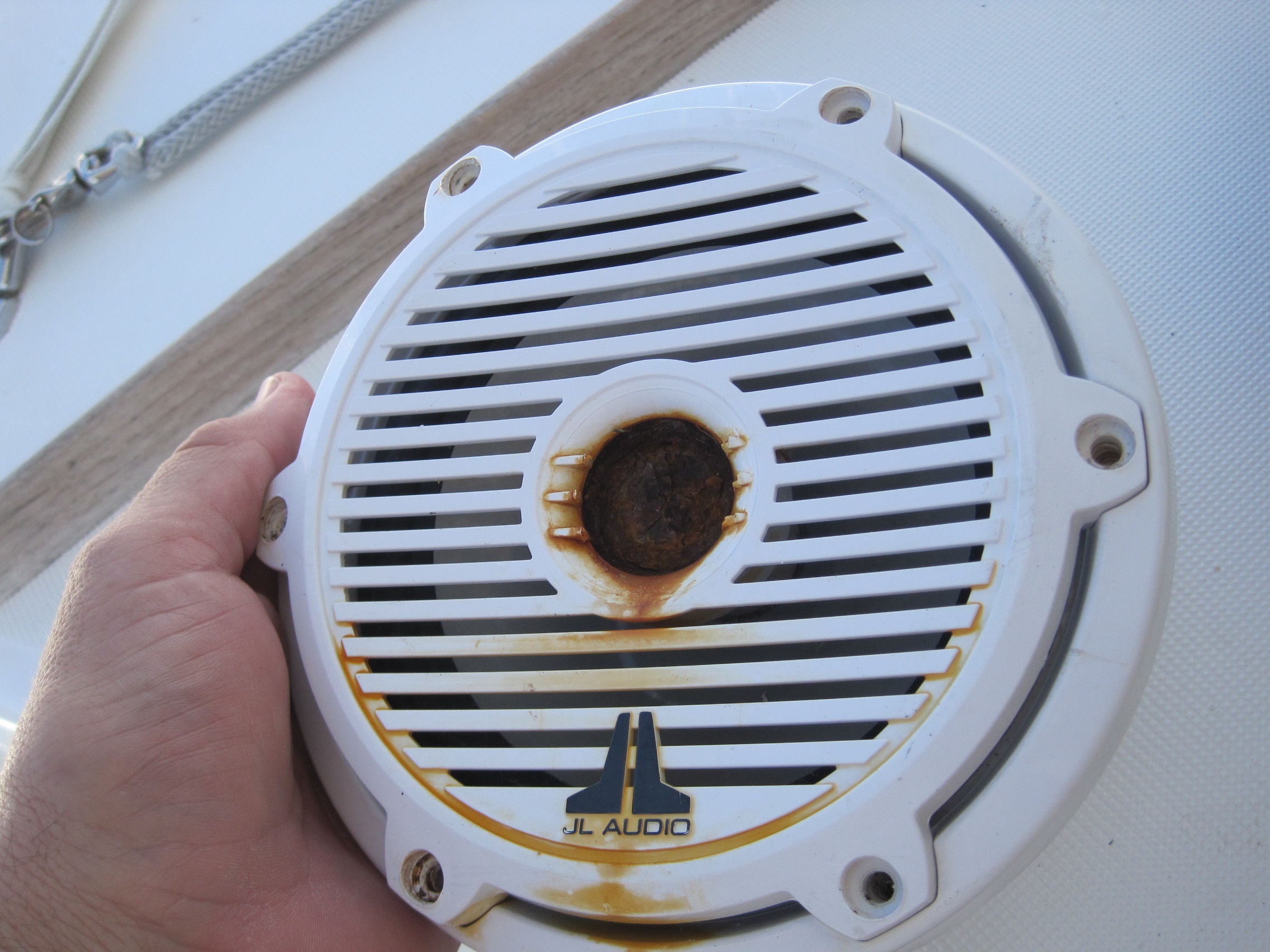 On Sophie’s transom are 2 plastic covers that partially protect the intake for air vents that go down into each of the engine rooms. They are mostly cosmetic but unfortunately over the last 5 years had faded into two different colors. One became tan, and the other became whitish. Having two-tone rear panels became annoying, but the Pacific Ocean solved this problem for us by ripping off one of the covers on the passage from Bora Bora to Rarotonga. Peter replaced both covers in matching white.