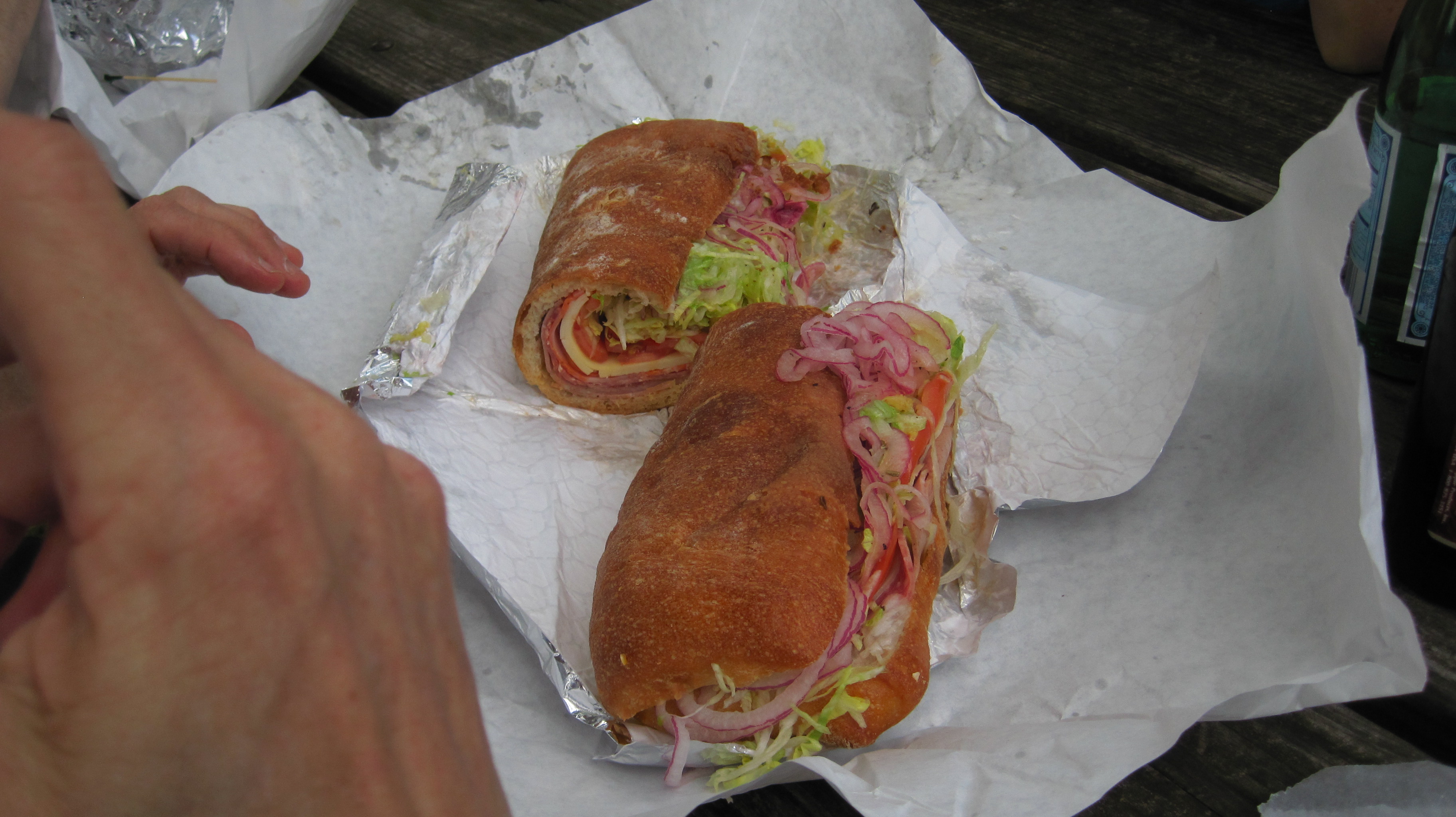 Phil and his wife Alice ordered a “4 Meat Grinder”, and the result was a sandwich almost a foot and a half long and weighing nearly 5 pounds. (“Grinder” is a northeast US term for a foot and a half long, 5 pound sandwich). This thing was even more impressive when it was laid out on a picnic table.