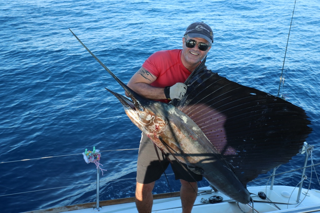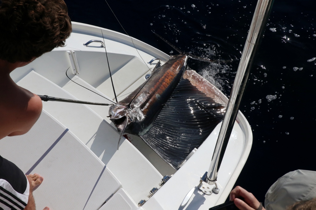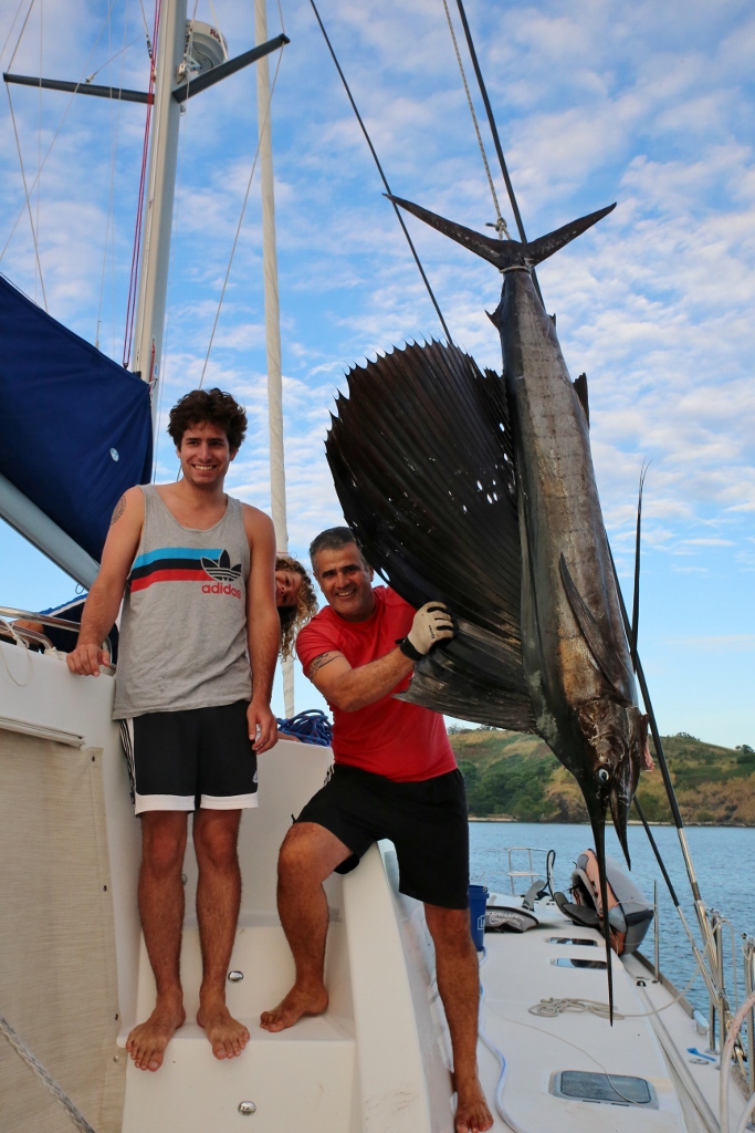 Silas had never caught a saltwater fish before, so despite our official Sophie moratorium on fishing until we freed up more room in the freezer, we trolled one line off the pole. Maybe we would catch a little tuna? That was not in the cards. Suddenly we heard the line run out over 300 feet in just a few seconds and looked back to see a huge billfish leap out of the water. I took the wheel while Jamie grabbed the pole to work the fish and 25 minutes later we landed a 100+ pound sailfish.