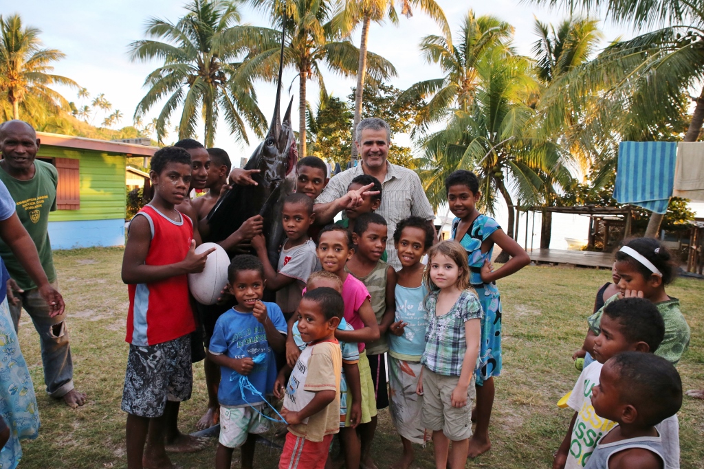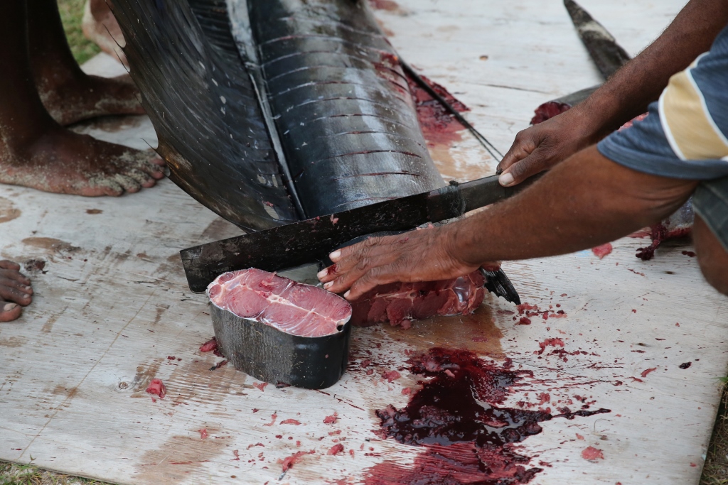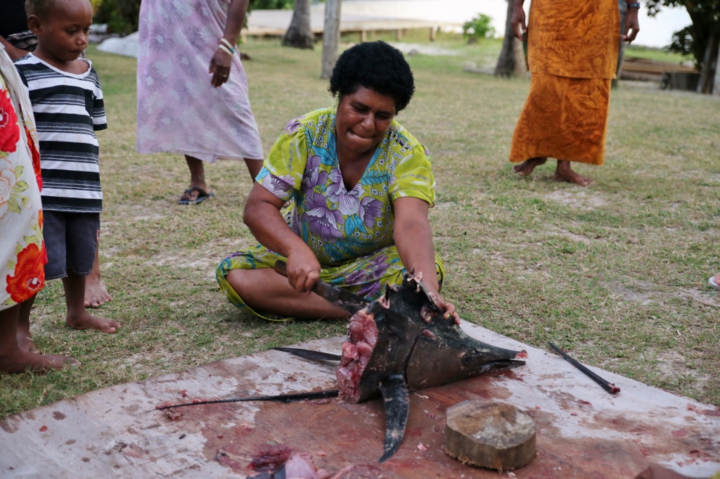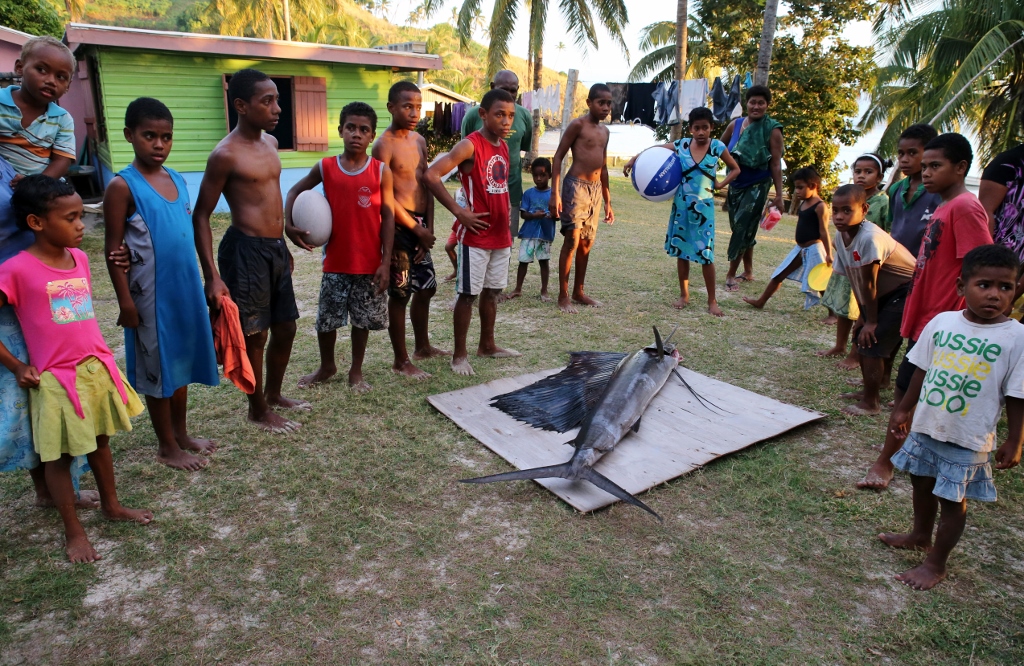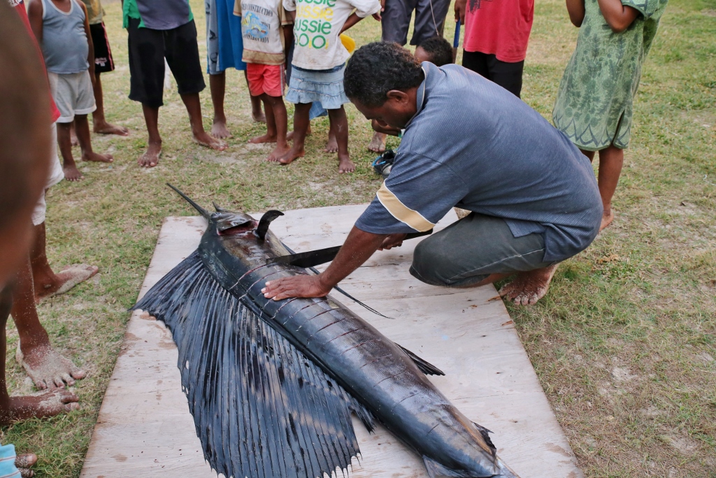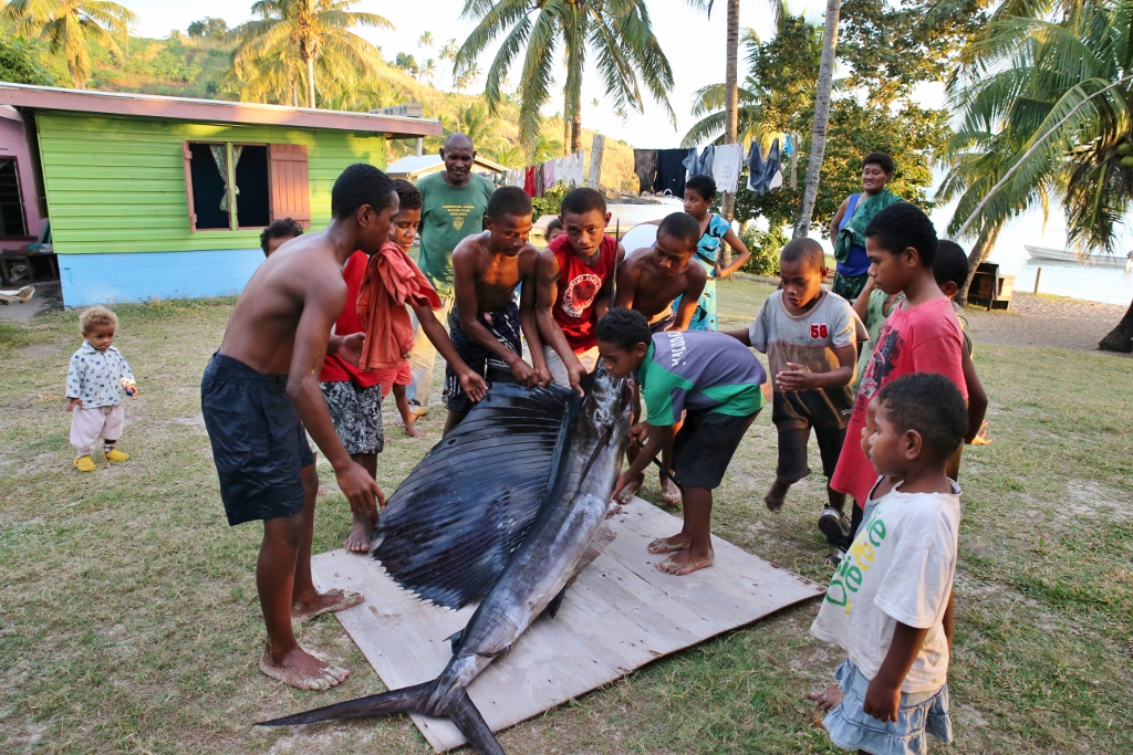 Right before the kava started, Jamie, Jeff and one of the locals went back to Sophie to retrieve the sailfish. Several of the moms met us on the beach and instructed a pack of boys to carry it up to a clearing between some houses. After posing for photos, they laid it out on a piece of plywood and set to work.