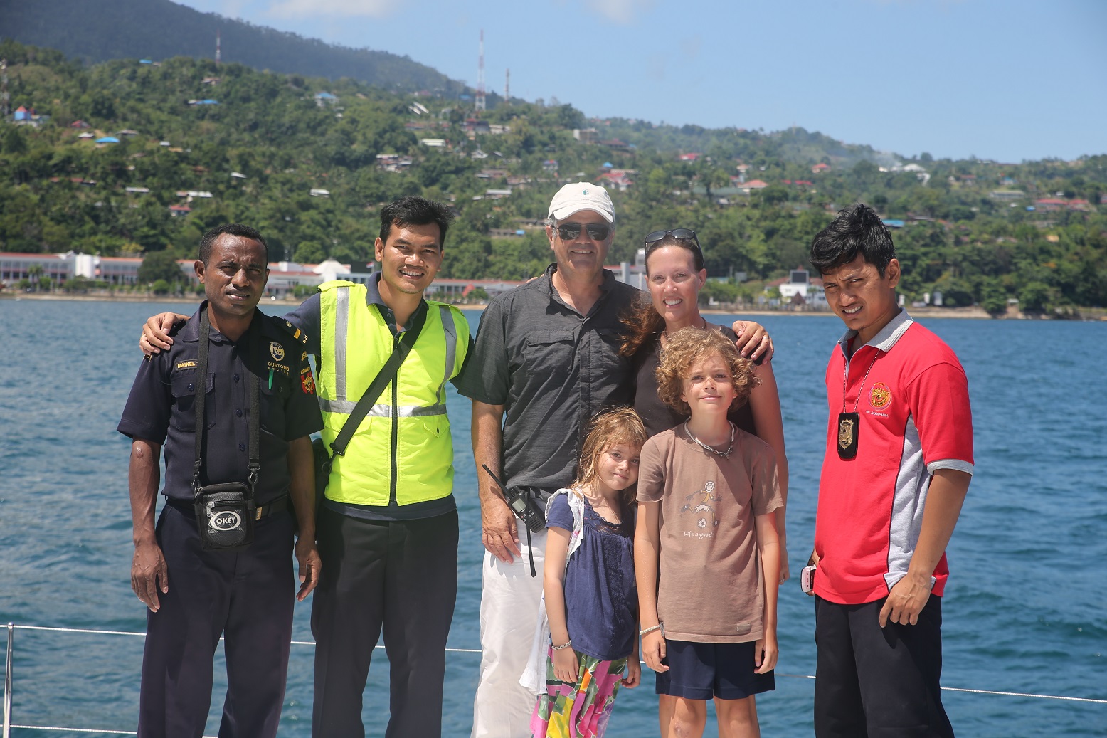 Sophie covered 130 miles in the last 24 hours, a period of time during which we experienced loud thumping noises against the hull, swimming, sharks, zig zagging, a massive thunder and lightning storm, pounding directly into 20+ knot winds, and a potential collision. We are currently motoring at 8.5 knots into a very light headwind with both engines running @ 2800 RPMs. Sorong is 20 miles away, and it’s only noontime here. Our baby smells the barn and is heading for home. Sophie’s current position is 00.38.186 South, 131.30.872 East. After four nights at sea, we WILL sleep at anchor tonight. I might even let my wife buy me a beer.