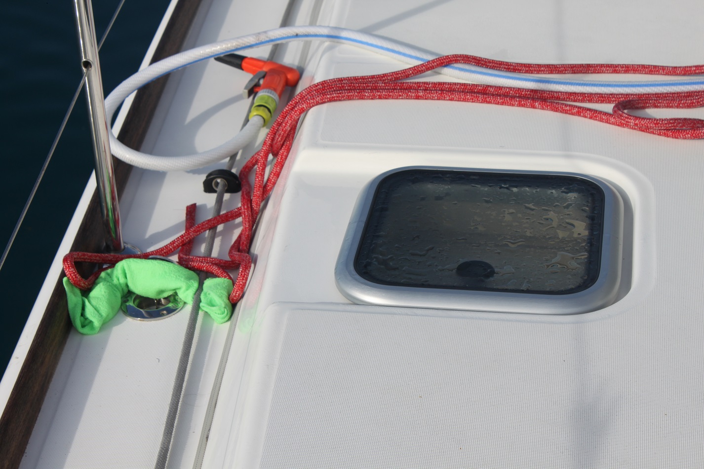 We didn’t get vey sophisticated here. Our deck fittings for the water tanks are located in gutters along the side of our foredeck. We simply rolled up some towels and placed them right behind the tank openings. We also laid out some sheets and hoses on the deck and coach roof to direct water towards the general direction of the tank openings.