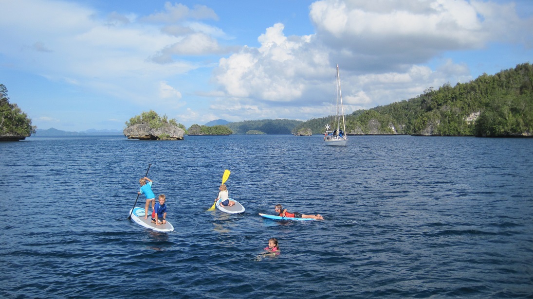 This is a small island 5 miles north of Yangello and is owned by the Raja4Divers resort. The Navionics chart shows Pef as being a single round island, but there is actually a deep lagoon in the middle of the island, and this lagoon has 2 moorings maintained by the resort. The moorings are at 00.26.556S, 130.26.625E, and a good waypoint for making your turn into the lagoon is 00.26.822S, 130.27.006E. The resort charges ~$20 US per adult for using the mooring, but in return encourage you to use their facilities (wifi, laundry, snacks, happy hour with complimentary beer.) We were short of cash (very few working ATMs in the area) and spent 3 nights there in return for taking the resort’s guests and staff out on a sunset sail. The kids enjoyed swimming in the lagoon until we saw the crocodile that was caught nearby. Jenna and Mellia had one of their best paddleboards ever, navigating the spectacular gumdrop islands in the lagoon. It was a great stop, and the people at the resort were quite friendly to cruisers.