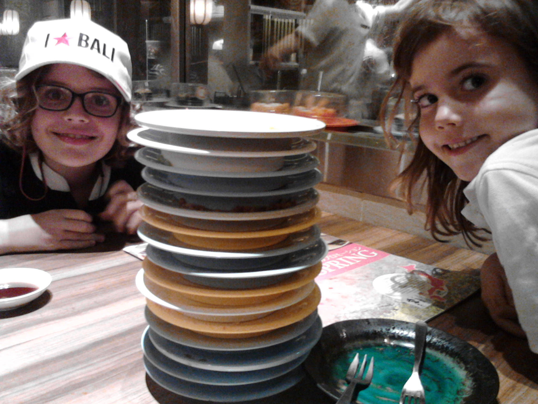 Also, we eat. And eat. And eat. Singapore has wonderful food. We go to the hawker stalls every day, where you can buy plates of sushi or noodles or dumplings or satay for $3-$4 dollars. We’ve been to German restaurants three times, eating wurst and schnitzel. On the night of GG’s death, Hazel suggested we go out for sushi since one of our last meals with GG last summer was an extensive sushi feast at Jenna’s parents’ house. So we went to a mall (where else) and the kids experienced their first ever sushi restaurant with a conveyor belt. They ate a LOT.
