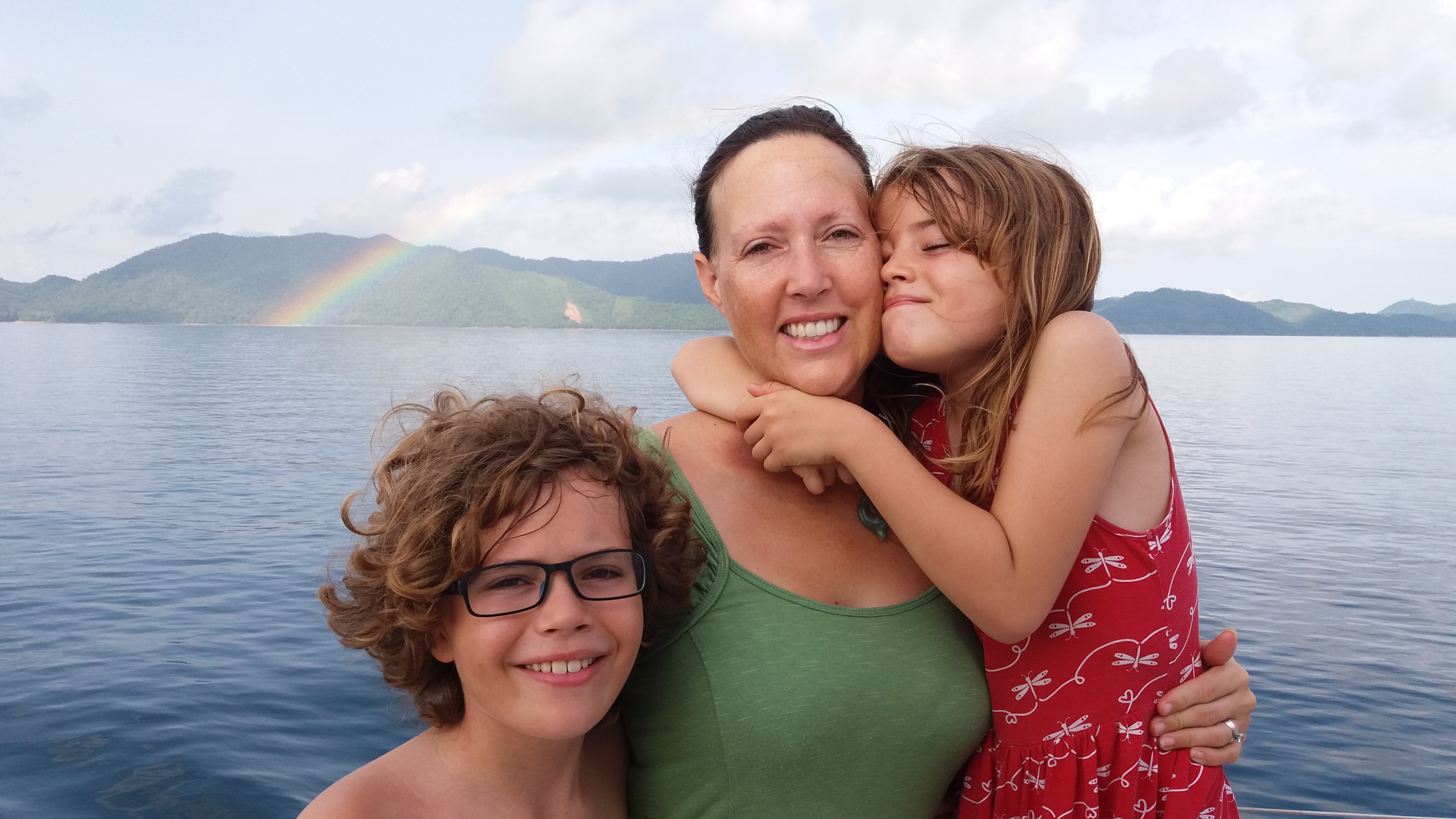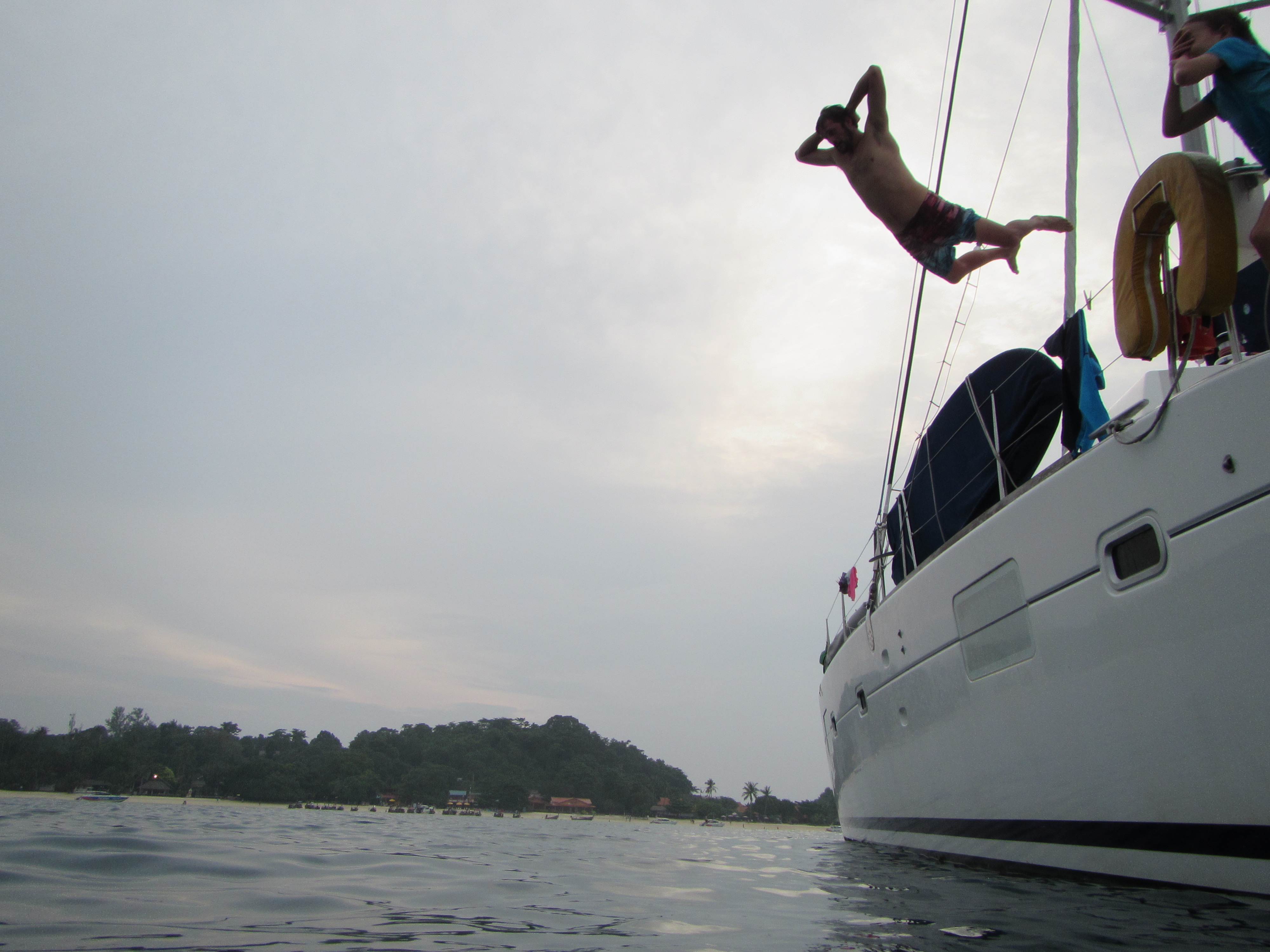 They had all recently graduated form Loyola Marymount University in Baltimore (which means they were Jesuit-trained, like me) and were taking the smart step of backpacking across Thailand before getting on with their careers and the rest of their lives. We hung out in the water for a few hours and had a great time, except that Kevin got bit by a monkey (it didn’t break his skin), I discovered that the new dinghy wouldn’t plane with 7 adults on board (which really bummed me out), and Jenna was so busy taking care of Leo that she never got her beer (she is a loving mother with incredible patience.) But we made some new friends and have a new story to tell. Also, as you can see from the photo, the Sumatra smoke was still with us.
